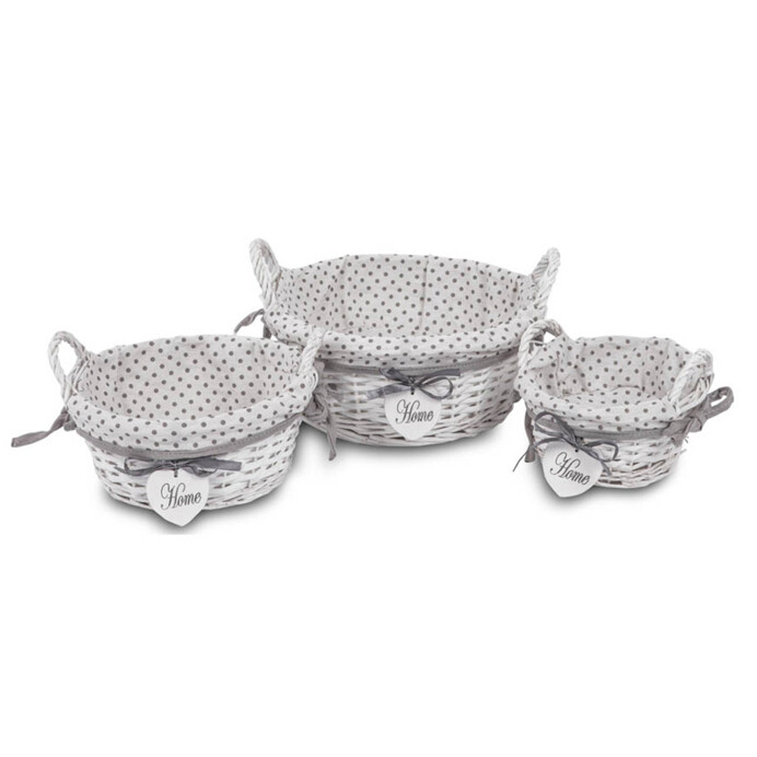 Tři proutěné košíky s uchy a vnitřní látkou jsou ideálním pomocníkem k ukládání věcí a zároveň jsou i hezkou interiérovou dekorací. Složení látky 70 % Bavlna + 30% Polyester, praní na 30°C.