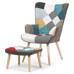 Relaxační křeslo s podnožkou v patchworkovém designu kombinuje vícebarevnou látku s pevnými nohami z masivního kaučukovníku, které zajišťují stabilitu a dlouhou životnost. Čalounění je tvořeno kvalitní látkou s různorodými vzory, která dodává křeslu výrazný vizuální efekt a zároveň příjemný povrch pro sezení. Křeslo je vybaveno pevnými područky, které podporují pohodlný posed, a doplněno o samostatný taburet pro maximální relaxaci nohou. Ergonomicky tvarované opěradlo a sedák poskytují komfortní oporu pro odpočinek. Tento set je ideální volbou pro interiéry, kde se klade důraz na barevnost a pohodlí.