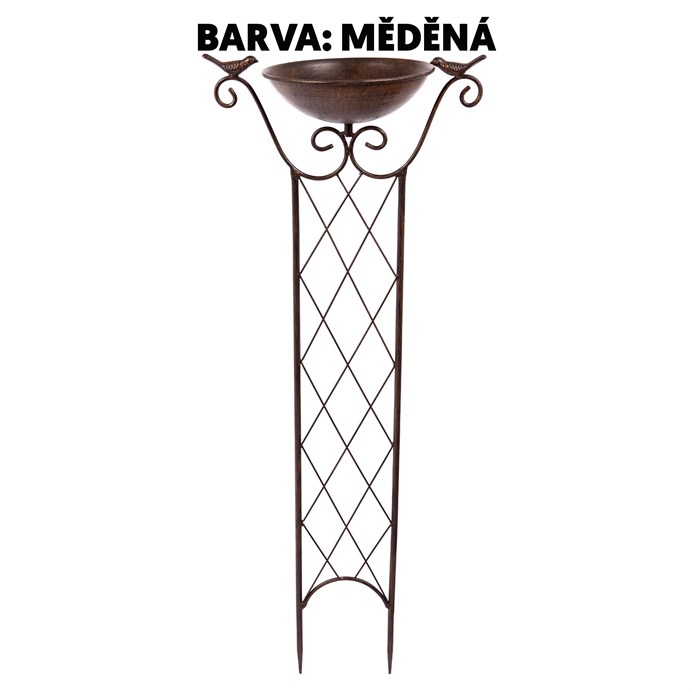 Kovový zápich v měděném odstínu nabízí praktické krmítko a pítko pro ptactvo s dekorativní mřížkou a miskou ozdobenou figurkami ptáčků. Vysoká konstrukce umožňuje snadné umístění do zahrady či na terasu, kde poskytuje osvěžení a potravu ptákům. Provedení z kovu je navrženo pro dlouhou životnost a snadnou údržbu, zatímco měděný tón dodává přírodní a decentní vzhled. Miska je dostatečně prostorná pro vodu i krmivo, což zajišťuje komfortní podmínky pro ptactvo. Zápich lze jednoduše zapíchnout do země, čímž se stabilně upevní na požadovaném místě.