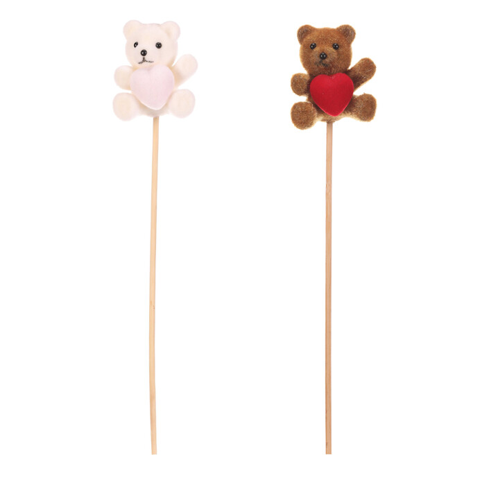 Dekorativní zápich s medvídkem v semišovém provedení je dostupný ve dvou barevných variantách – hnědé a bílé. Malý medvídek drží červené nebo růžové srdce, které přidává jemný romantický detail. Dřevěná špejle umožňuje snadné zapíchnutí do květináče, aranžmá nebo dekorativních vazeb. Vhodný je pro doplnění jarních i svátečních dekorací, kde zvýrazní přátelskou a vřelou atmosféru. Velikost S zajišťuje univerzální použití v různých typech aranžmá.