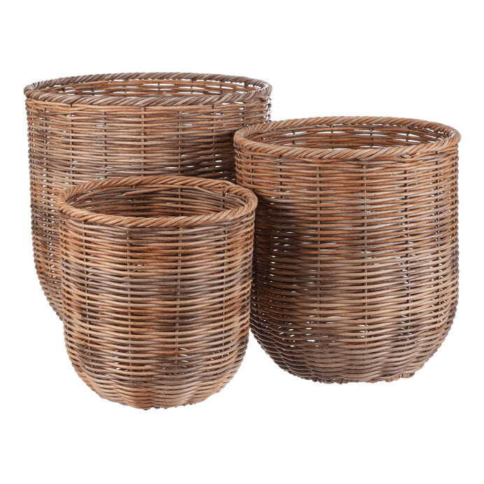 Sada tří obalů vyrobených z umělého ratanu v odstínu světle hnědé nabízí praktické a zároveň estetické řešení pro květináče i další dekorace. Polyratanové provedení je odolné vůči povětrnostním vlivům a snadno se udržuje, zatímco kovová výztuha zajišťuje stabilitu a pevnost. Kulatý tvar s mírně rozšířeným horním okrajem vytváří příjemný vizuální efekt a umožňuje snadné umístění květináčů různých velikostí. Díky sadě tří kusů v různých rozměrech je možné vytvořit zajímavou kompozici v interiéru i exteriéru.
