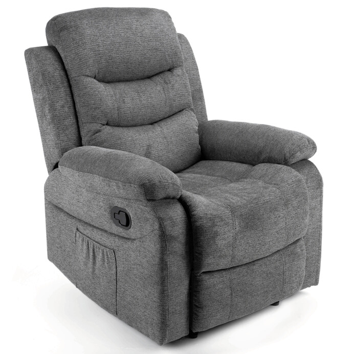 Polohovací křeslo s manuálním ovládáním je potažené šedou žinilkovou látkou, která nabízí příjemný a odolný povrch vhodný pro dlouhodobé užívání. Pevná kovová konstrukce nohou zajišťuje stabilitu a bezpečnost při sezení. Křeslo je vybaveno širokými čalouněnými područkami a designovým prošitím, které podtrhuje jeho moderní vzhled. Manuální mechanismus umožňuje snadné nastavení polohy opěradla a podnožky pro maximální komfort. Díky promyšlenému tvarování sedáku a opěradla poskytuje ergonomickou podporu tělu během odpočinku.