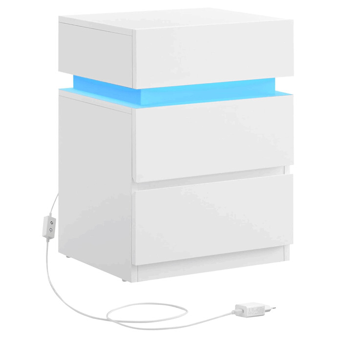 Moderní noční stolek značky Autronic zaujme minimalistickým designem i praktickým provedením se třemi zásuvkami. Je ideálním doplňkem do ložnic v moderním i futuristickém stylu. Integrované LED podsvícení nabízí až 25 barev, které snadno nastavíte pomocí dálkového ovládání nebo přepínače, a vytvoříte si tak atmosféru podle nálady. Stolek poskytuje dostatek úložného prostoru pro drobnosti, knihy i elektroniku. Perfektní kombinace designu a funkčnosti pro stylové interiéry.