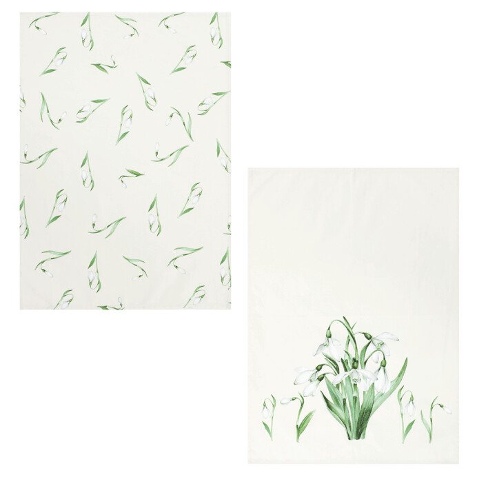 Sada dvou bavlněných utěrek zdobených motivem sněženek v jemných zelených odstínech přináší do kuchyně svěží jarní atmosféru. Utěrky jsou vyrobeny z přírodní bavlny, která se snadno udržuje a je příjemná na dotek. Jeden kus je potištěn drobnými květinovými vzory po celé ploše, druhý nese větší květinový motiv doplněný nápisem „spring time“. Díky rozměrům jsou vhodné pro běžné kuchyňské použití i jako dekorativní doplněk. Přírodní materiál zajišťuje dobrou savost a dlouhou životnost.