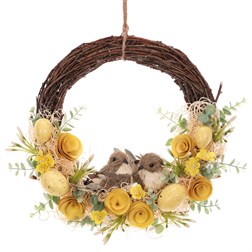 Věnec proutěný - pr. 32 cm, ptáčci, žluté květy a vajíčka