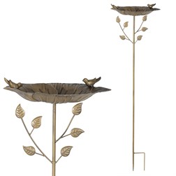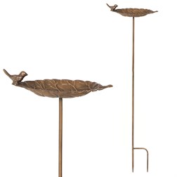 Krmítko/pítko - kovový zápich, list s ptáčkem, měděné-antik