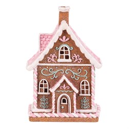 Domeček perníkový - polyresin, LED osvětl., hnědý s bílým zdobením